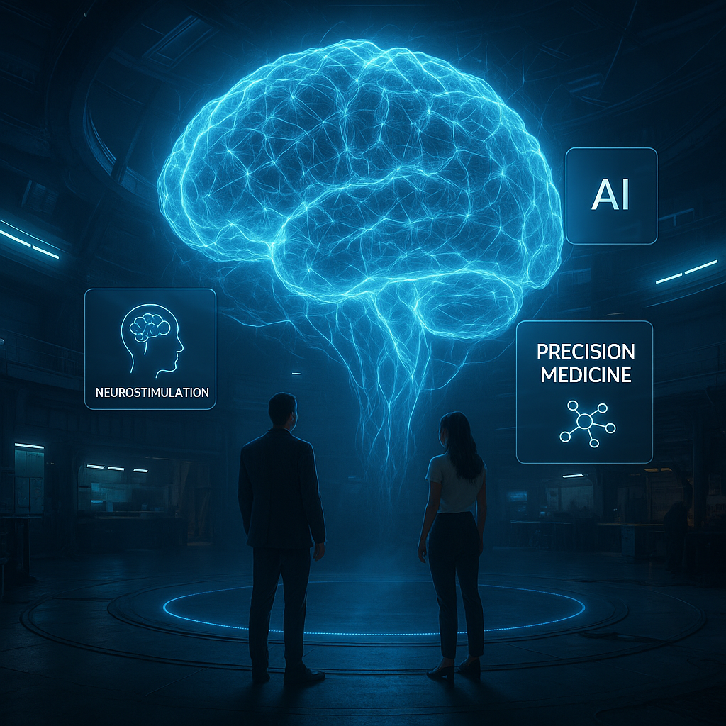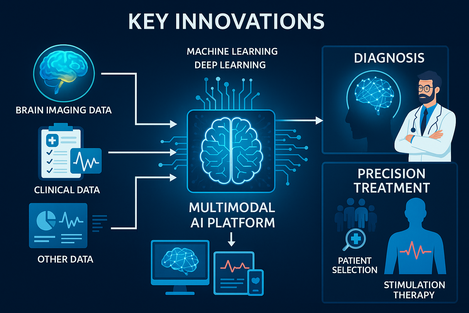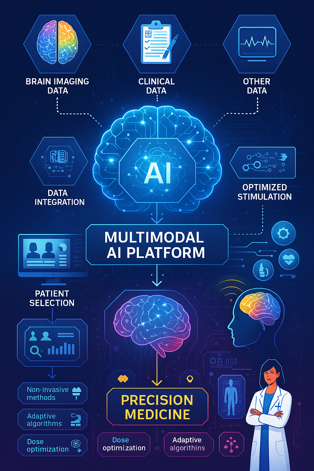 Combines neuroimaging, clinical assessments, and behavioral data to drive individualized predictions and precision neuromodulation strategies.